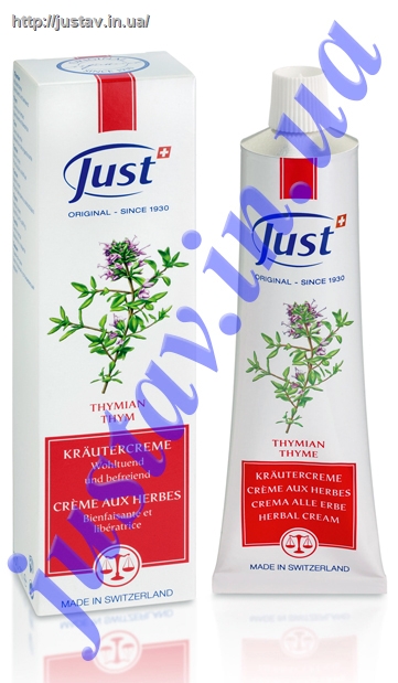 Крем Тимьян Just является, прежде всего, идеальным средством от простуды (экстракт тимьяна входит в состав препарата пертуссин). При нанесении на область носогубного треугольника, спину и грудь крем благоприятно действует на дыхательные пути. Снимает спазм бронхов, обладает дезинфицирующим, противовоспалительным, отхаркивающим и иммуностимулирующим действием, благодаря наличию хвойных масел (сосна, эвкалипт).